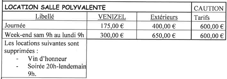 Pour connaître les disponibilités de la salle, vous pouvez contacter la mairie au : 03.23.72.40.09 ou par mail : mairie@mairiedevenizel.fr